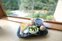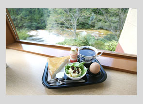 店内の窓から、奥三河の清流板敷川の絶景が眺められ、木々の間から差し込む緑の光線を受けながらゆっくりとコーヒーを満喫できる。